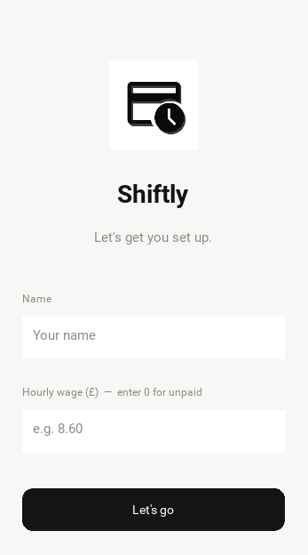 Shiftly is a simple, lightweight shift tracking app built for quickly logging and managing your work hours.